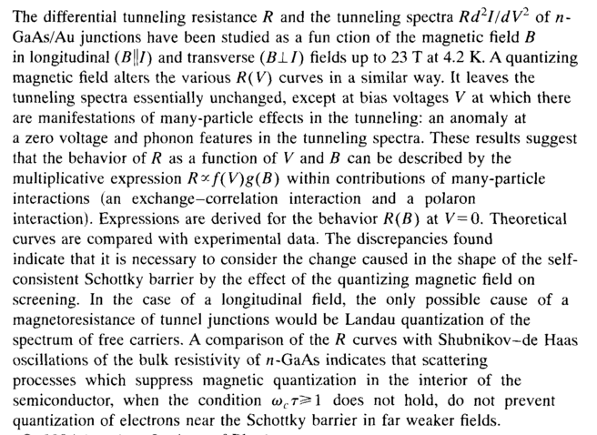 The differential tunneling resistance R and the tunneling spectra Rd2I/dV2 of n-GaAs/Au junctions have been studied as a fun ction of the magnetic field В in longitudinal (B\\l) and transverse (B1I) fields up to 23 Τ at 4.2 K. A quantizing magnetic field alters the various R(V) curves in a similar way. It leaves the tunneling spectra essentially unchanged, except at bias voltages V at which there are manifestations of many-particle effects in the tunneling: an anomaly at a zero voltage and phonon features in the tunneling spectra. These results suggest that the behavior of Я as a function of V and В can be described by the multiplicative expression R*-f(V)g(B) within contributions of many-particle interactions (an exchange-correlation interaction and a polaron interaction). Expressions are derived for the behavior R(B) at V=0. Theoretical curves are compared with experimental data. The discrepancies found indicate that it is necessary to consider the change caused in the shape of the self-consistent Schottky barrier by the effect of the quantizing magnetic field on screening. In the case of a longitudinal field, the only possible cause of a magnetoresistance of tunnel junctions would be Landau quantization of the spectrum of free carriers. A comparison of the R curves with Shubnikov-de Haas oscillations of the bulk resistivity of n-GaAs indicates that scattering processes which suppress magnetic quantization in the interior of the semiconductor, when the condition wct^1 does not hold, do not prevent quantization of electrons near the Schottky barrier in far weaker fields.