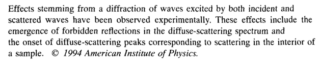 Effects stemming from a diffraction of waves excited by both incident and scattered waves have been observed experimentally. These effects include the emergence of forbidden reflections in the diffuse-scattering spectrum and the onset of diffuse-scattering peaks corresponding to scattering in the interior of a sample. © 1994 American Institute of Physics.