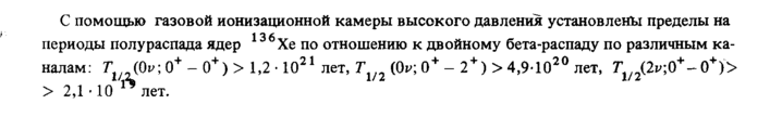 С помощью газовой ионизационной камеры высокого давления установлены пределы на периоды полураспада ядер Хе по отношению к двойному бета-распаду по различным каналам: Т. (Ov; 0+ 0+) > 1,2 · 1021 лет, Τ (Ον; 0+ 2+) > 4,9-Ю20 лет, Τ (2ν;0+ ~~ 0+)> ХЛ^ь X/ £* X/ £ > 2,1-10 " лет.