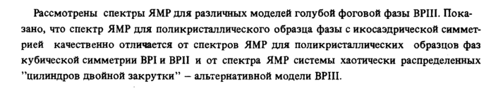 Рассмотрены спектры ЯМР для различных моделей голубой фоговой фазы ВРШ. Показано, что спектр ЯМР для поликристаллического образца фазы с икосаэдрической симметрией качественно отличается от спектров ЯМР для поликристаллических образцов фаз кубической симметрии BPI и ВРИ и от спектра ЯМР системы хаотически распределенных "цилиндров двойной закрутки" альтернативной модели ВРШ.