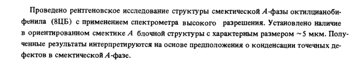 Проведено рентгеновское исследование структуры смектической Л-фазы октилцианоби-фенила (8ЦБ) с применением спектрометра высокого разрешения. Установлено наличие в ориентированном смектике А блочной структуры с характерным размером ~5 мкм. Полученные результаты интерпретируются на основе предположения о конденсации точечных дефектов в смектической А -фазе.