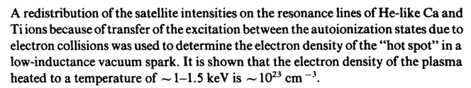 A redistribution of the satellite intensities on the resonance lines of He-like Ca and Ti ions because of transfer of the excitation between the autoionization states due to electron collisions was used to determine the electron density of the "hot spot" in a low-inductance vacuum spark. It is shown that the electron density of the plasma heated to a temperature of ~1-1.5 keV is ~1023 cm-3.
