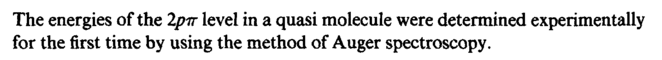 The energies of the 2ρπ level in a quasi molecule were determined experimentally for the first time by using the method of Auger spectroscopy.