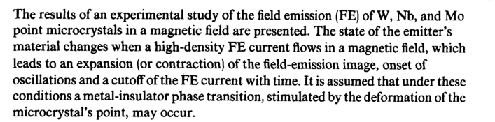 The results of an experimental study of the field emission (FE) of W, Nb, and Mo point microcrystals in a magnetic field are presented. The state of the emitter's material changes when a high-density FE current flows in a magnetic field, which leads to an expansion (or contraction) of the field-emission image, onset of oscillations and a cutoff of the FE current with time. It is assumed that under these conditions a metal-insulator phase transition, stimulated by the deformation of the microcrystal's point, may occur.