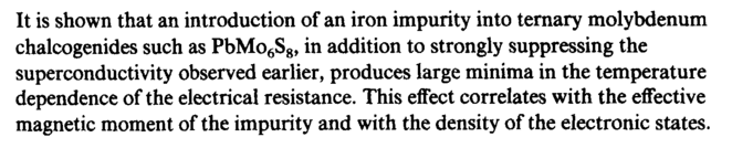 It is shown that an introduction of an iron impurity into ternary molybdenum chalcogenides such as PbMo6S8, in addition to strongly suppressing the superconductivity observed earlier, produces large minima in the temperature dependence of the electrical resistance. This effect correlates with the effective magnetic moment of the impurity and with the density of the electronic states.