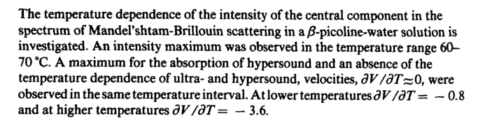 The temperature dependence of the intensity of the central component in the spectrum of Mandershtam-Brillouin scattering in a /?-picoline-water solution is investigated. An intensity maximum was observed in the temperature range 60-70 °C. A maximum for the absorption of hypersound and an absence of the temperature dependence of ultraand hypersound, velocities, dV/dTzzQ, were observed in the same temperature interval. At lower temperatures Ä V/Äô = — 0.8 and at higher temperatures dV/Äô = — 3.6.