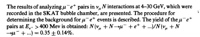 The results of analyzing μ ~e* pairs in νμ N interactions at 4-30 GeV, which were recorded in the SKAT bubble chamber, are presented. The procedure for determining the background for μ " e+ events is described. The yield of the μ ~ pairs at Ee+ > 400 Mev is obtained: Ν{νμ + Ν-+μ~ + e+ + -)/Ν{νμ + Ν -^u" + ...) = 0.35 ±0.14%.