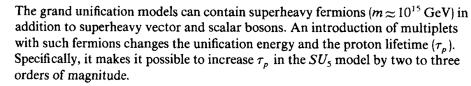 The grand unification models can contain superheavy fermions (m ~ 1015 GeV) in addition to superheavy vector and scalar bosons. An introduction of multiplets with such fermions changes the unification energy and the proton lifetime (τρ). Specifically, it makes it possible to increase τρ in the SUS model by two to three orders of magnitude.