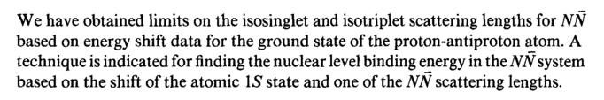 We have obtained limits on the isosinglet and isotriplet scattering lengths for NN based on energy shift data for the ground state of the proton-antiproton atom. A technique is indicated for finding the nuclear level binding energy in the NN system based on the shift of the atomic IS state and one of the NN scattering lengths.