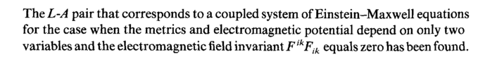 The L-A pair that corresponds to a coupled system of Einstein-Maxwell equations for the case when the metrics and electromagnetic potential depend on only two variables and the electromagnetic field invariant F ikFik equals zero has been found.