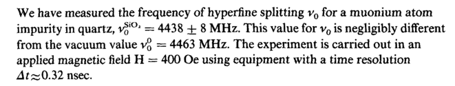 We have measured the frequency of hyperfine splitting v0 for a muonium atom impurity in quartz, v^i0i = 4438 ± 8 MHz. This value for v0 is negligibly different from the vacuum value v£ = 4463 MHz. The experiment is carried out in an applied magnetic field Η = 400 Oe using equipment with a time resolution At-032 nsec.