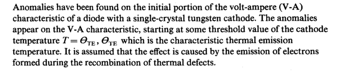 Anomalies have been found on the initial portion of the volt-ampere (V-A) characteristic of a diode with a single-crystal tungsten cathode. The anomalies appear on the V-A characteristic, starting at some threshold value of the cathode temperature Τ = ΘΎΕ, ΘΎΕ which is the characteristic thermal emission temperature. It is assumed that the effect is caused by the emission of electrons formed during the recombination of thermal defects.
