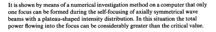 It is shown by means of a numerical investigation method on a computer that only one focus can be formed during the self-focusing of axially symmetrical wave beams with a plateau-shaped intensity distribution. In this situation the total power flowing into the focus can be considerably greater than the critical value.
