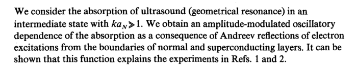 We consider the absorption of ultrasound (geometrical resonance) in an intermediate state with kaN>l. We obtain an amplitude-modulated oscillatory dependence of the absorption as a consequence of Andreev reflections of electron excitations from the boundaries of normal and superconducting layers. It can be shown that this function explains the experiments in Refs. 1 and 2.
