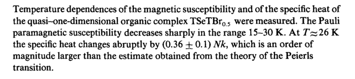 Temperature dependences of the magnetic susceptibility and of the specific heat of the quasi-one-dimensional organic complex TSeTBr0 5 were measured. The Pauli paramagnetic susceptibility decreases sharply in the range 15-30 K. At T~26 К the specific heat changes abruptly by (0.36 + 0.1) Nk, which is an order of magnitude larger than the estimate obtained from the theory of the Peierls transition.