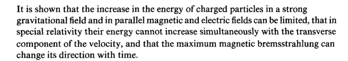 It is shown that the increase in the energy of charged particles in a strong gravitational field and in parallel magnetic and electric fields can be limited, that in special relativity their energy cannot increase simultaneously with the transverse component of the velocity, and that the maximum magnetic bremsstrahlung can change its direction with time.