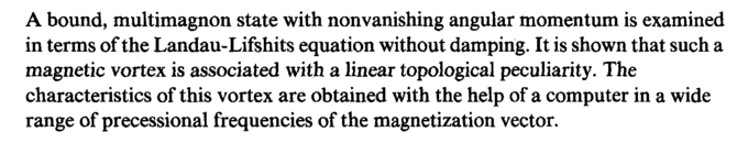 A bound, multimagnon state with nonvanishing angular momentum is examined in terms of the Landau-Lifshits equation without damping. It is shown that such a magnetic vortex is associated with a linear topological peculiarity. The characteristics of this vortex are obtained with the help of a computer in a wide range of precessional frequencies of the magnetization vector.