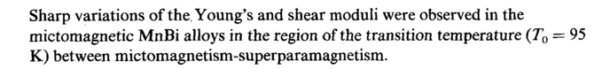 Sharp variations of the, Young's and shear moduli were observed in the mictomagnetic MnBi alloys in the region of the transition temperature (7*0 = 95 К) between mictomagnetism-superparamagnetism.