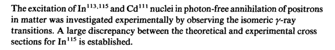 The excitation of In113115 and Cd111 nuclei in photon-free annihilation of positrons in matter was investigated experimentally by observing the isomeric T'-ray transitions. A large discrepancy between the theoretical and experimental cross sections for In115 is established.