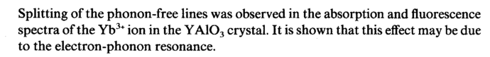 Splitting of the phonon-free lines was observed in the absorption and fluorescence spectra of the Yb3+ ion in the YA103 crystal. It is shown that this effect may be due to the electron-phonon resonance.