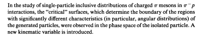 In the study of single-particle inclusive distributions of charged π mesons in ir ~p interactions, the "critical" surfaces, which determine the boundary of the regions with significantly different characteristics (in particular, angular distributions) of the generated particles, were observed in the phase space of the isolated particle. A new kinematic variable is introduced.