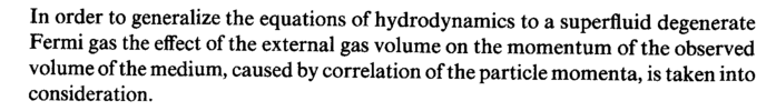 In order to generalize the equations of hydrodynamics to a superfluid degenerate Fermi gas the effect of the external gas volume on the momentum of the observed volume of the medium, caused by correlation of the particle momenta, is taken into consideration.