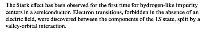 The Stark effect has been observed for the first time for hydrogen-like impurity centers in a semiconductor. Electron transitions, forbidden in the absence of an electric field, were discovered between the components of the \S state, split by a valley-orbital interaction.
