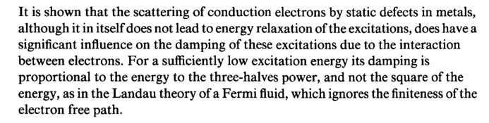 It is shown that the scattering of conduction electrons by static defects in metals, although it in itself does not lead to energy relaxation of the excitations, does have a significant influence on the damping of these excitations due to the interaction between electrons. For a sufficiently low excitation energy its damping is proportional to the energy to the three-halves power, and not the square of the energy, as in the Landau theory of a Fermi fluid, which ignores the finiteness of the electron free path.