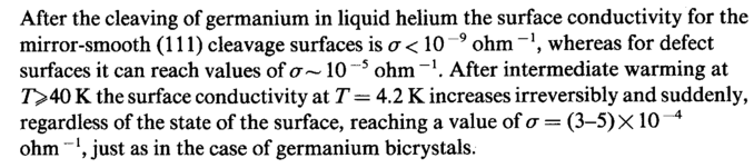 After the cleaving of germanium in liquid helium the surface conductivity for the mirror-smooth (111) cleavage surfaces is σ< 10~9 ohm_1, whereas for defect surfaces it can reach values of σ~ 10 ~5 ohm _1. After intermediate warming at 7>40 К the surface conductivity at Τ — 4.2 К increases irreversibly and suddenly, regardless of the state of the surface, reaching a value of σ = (3-5) χ 10 4 ohm just as in the case of germanium bicrystals.
