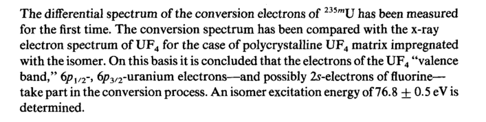 The differential spectrum of the conversion electrons of 235mU has been measured for the first time. The conversion spectrum has been compared with the x-ray electron spectrum of UF4 for the case of polycrystalline UF4 matrix impregnated with the isomer. On this basis it is concluded that the electrons of the UF4 "valence band," 6pU2-, брз/2-uranium electrons—and possibly 2^-electrons of fluorine— take part in the conversion process. An isomer excitation energy of 76.8 ± 0.5 eV is determined.