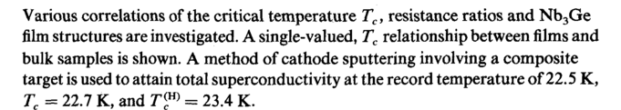 Various correlations of the critical temperature Tc) resistance ratios and Nb3Ge film structures are investigated. A single-valued, Tc relationship between films and bulk samples is shown. A method of cathode sputtering involving a composite target is used to attain total superconductivity at the record temperature of 22.5 K, Tc = 22.7 K, and T<™ = 23.4 K.