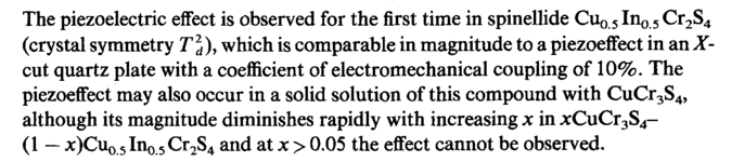 The piezoelectric effect is observed for the first time in spinellide Cu0 5 In0 5 Cr2S4 (crystal symmetry T2d)> which is comparable in magnitude to a piezoefFect in anX-cut quartz plate with a coefficient of electromechanical coupling of 10%. The piezoeffect may also occur in a solid solution of this compound with CuCr3S4, although its magnitude diminishes rapidly with increasing χ in *CuCr3S4-(1 — x)C\1q 5In0 5Cr2S4 and at jc > 0.05 the effect cannot be observed.
