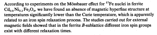 According to experiments on the Mossbauer effect for 57Fe nuclei in ferrite Cdo 8 Ni0 2 Fe204, we have found an absence of magnetic hyperfine structure at temperatures significantly lower than the Curie temperature^ which is apparently related to an iron spin relaxation process. The studies carried out for external magnetic fields showed that in the ferrite Б-sublattice different iron spin groups exist with different relaxation times.