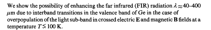 We show the possibility of enhancing the far infrared (FIR) radiation A ~40-400 μτη due to interband transitions in the valence band of Ge in the case of overpopulation of the light sub-band in crossed electric Ε and magnetic В fields at a temperature TS 100 K.