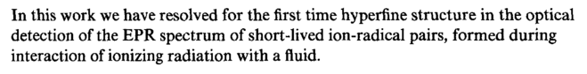 In this work we have resolved for the first time hyperfine structure in the optical detection of the EPR spectrum of short-lived ion-radical pairs, formed during interaction of ionizing radiation with a fluid.