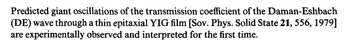 Predicted giant oscillations of the transmission coefficient of the Daman-Eshbach (DE) wave through a thin epitaxial YIG film [Sov. Phys. Solid State 21, 556,1979] are experimentally observed and interpreted for the first time.