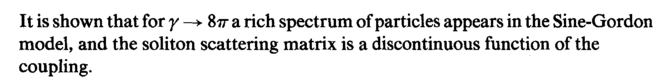 It is shown that for γ —> 877 a rich spectrum of particles appears in the Sine-Gordon model, and the soliton scattering matrix is a discontinuous function of the coupling.
