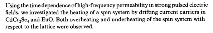 Using the time dependence of high-frequency permeability in strong pulsed electric fields, we investigated the heating of a spin system by drifting current carriers in CdCr2Se4 and EuO. Both overheating and underheating of the spin system with respect to the lattice were observed.