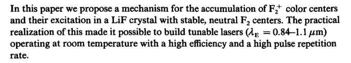 In this paper we propose a mechanism for the accumulation of F2+ color centers and their excitation in a LiF crystal with stable, neutral F2 centers. The practical realization of this made it possible to build tunable lasers (ДЕ = 0.84—1.1 μηϊ) operating at room temperature with a high efficiency and a high pulse repetition rate.