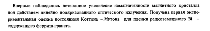 Впервые наблюдалось нетепловое увеличение намагниченности магнитного кристалла под действием линейно поляризованного оптического излучения. Получена первая экспериментальная оценка постоянной Коттона Мутона для пленки редкоземельного Bi — содержащего феррита-граната.