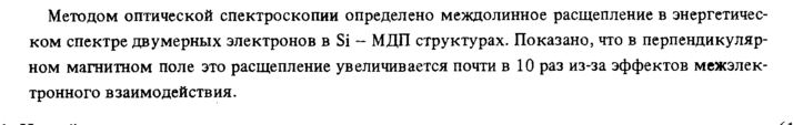 Методом оптической спектроскопии определено междолинное расщепление в энергетическом спектре двумерных электронов в Si МДП структурах. Показано, что в перпендикулярном магнитном поле это расщепление увеличивается почти в 10 раз из-за эффектов межэлектронного взаимодействия.