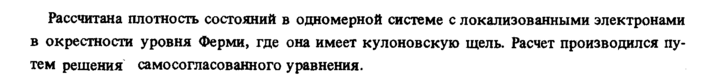 Рассчитана плотность состояний в одномерной системе с локализованными электронами в окрестности уровня Ферми, где она имеет кулоновскую щель. Расчет производился путем решения самосогласованного уравнения.