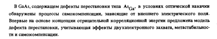 В GaAs, содержащем дефекты перестановки типа As^a, в условиях оптической накачки обнаружены процессы самокомпенсации, зависящие от внешнего электрического поля, Впервые на основе концепции отрицательной корреляционной энергии предложена модель дефекта перестановки, учитывающая эффекты двухэлектронного захвата, метастабильнос-ти и самокомпенсации.