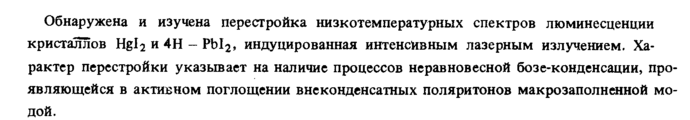 Обнаружена и изучена перестройка низкотемпературных спектров люминесценции кристаллов Hgl2 и 4Н РЫ2» индуцированная интенсивным лазерным излучением. Характер перестройки указывает на наличие процессов неравновесной бозе-конденсации, проявляющейся в активном поглощении внеконденсатных поляритонов макрозаполненной модой.