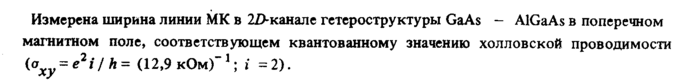 Измерена ширина линии МК в 2/>канале гетероструктуры GaAs AlGaAs в поперечном магнитном поле, соответствующем квантованному значению холловской проводимости (oxy = e2i/h= (12,9 кОм)"1; i =2).
