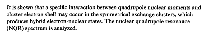 It is shown that a specific interaction between quadrupole nuclear moments and cluster electron shell may occur in the symmetrical exchange clusters, which produces hybrid electron-nuclear states. The nuclear quadrupole resonance (NQR) spectrum is analyzed.