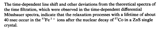 The time-dependent line shift and other deviations from the theoretical spectra of the time filtration, which were observed in the time-dependent differential Mossbauer spectra, indicate that the relaxation processes with a lifetime of about 40 nsec occur in the 57Fe2 + ions after the nuclear decay of 57Co in a ZnS single crystal.