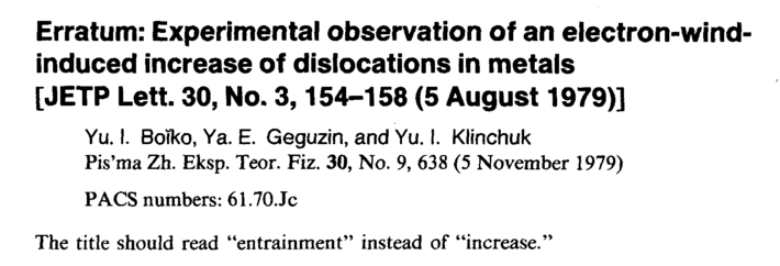 Erratum: Experimental observation of an electron-wind-induced increase of dislocations in metals [JETP Lett. 30, No. 3. 154-158 (5 August 1979)1