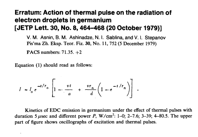 Erratum: Action of thermal pulse on the radiation of electron droplets in germanium [JETP Lett. 30, No. 8, 464-468 (20 October 1979)]
