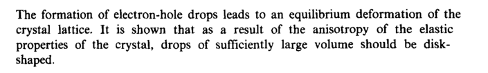 The formation of electron-hole drops leads to an equilibrium deformation of the crystal lattice. It is shown that as a result of the anisotropy of the elastic properties of the crystal, drops of sufficiently large volume should be disk-shaped.